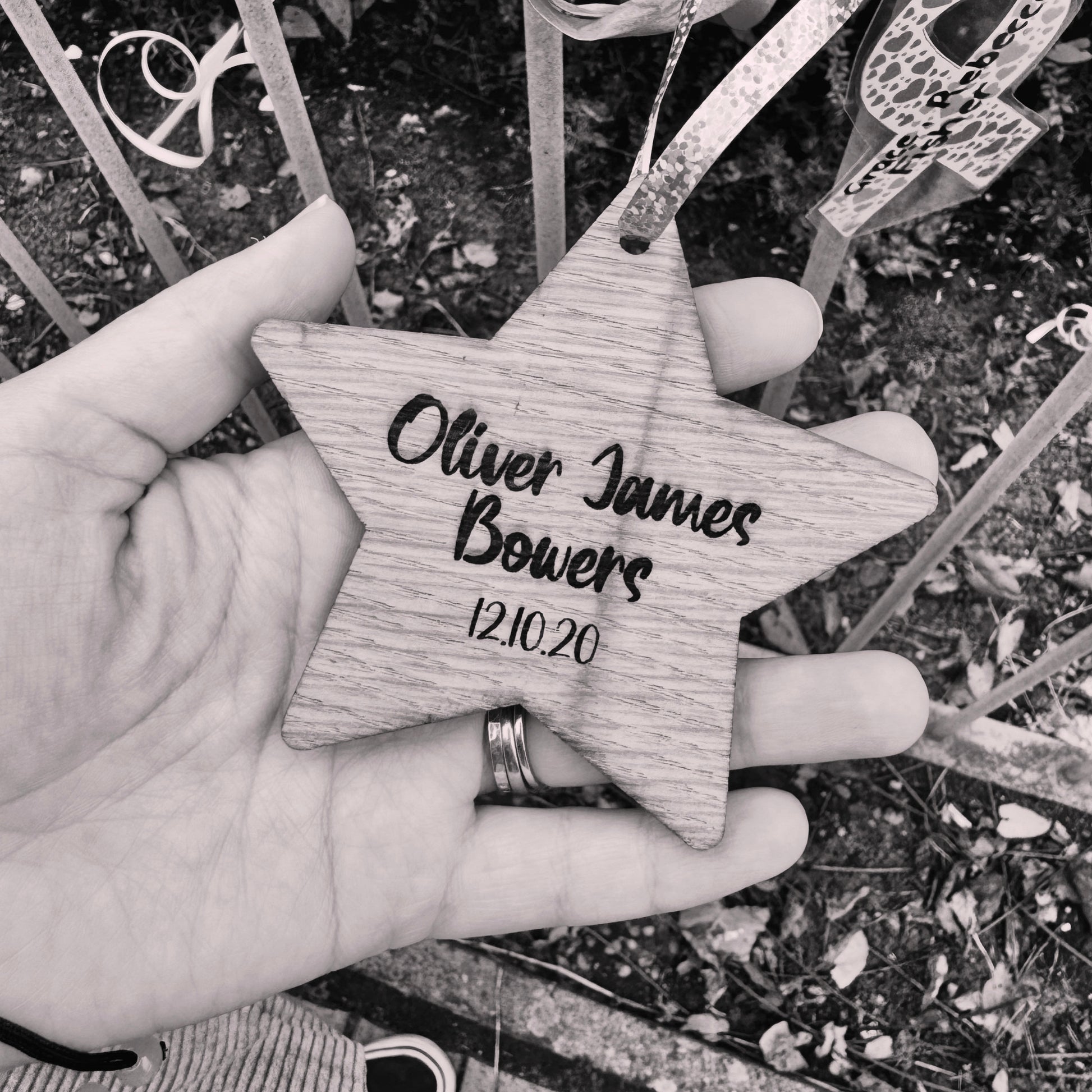 Celebrate and remember your little one with a beautifully crafted 9cm wooden oak veneer hanging star, personalised with your baby’s name and date.