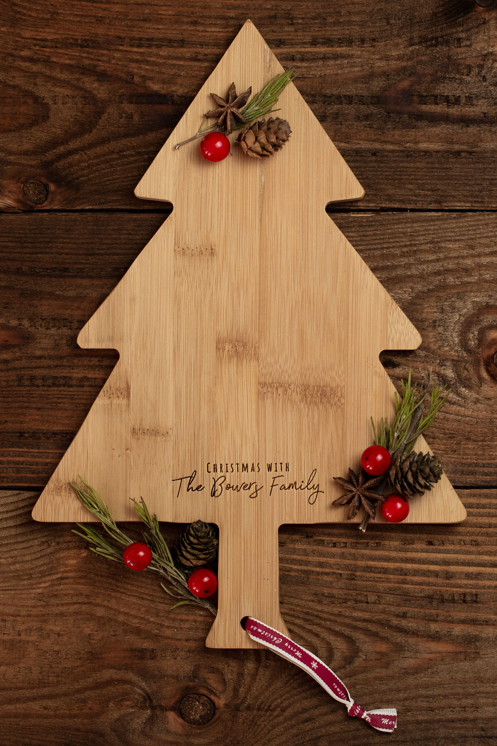 Boards are 33cm x 23cm and made from environmentally sustainable bamboo. Food safe and wipe clean. The boards are finished with our deep berry red 'Merry Christmas' ribbon.