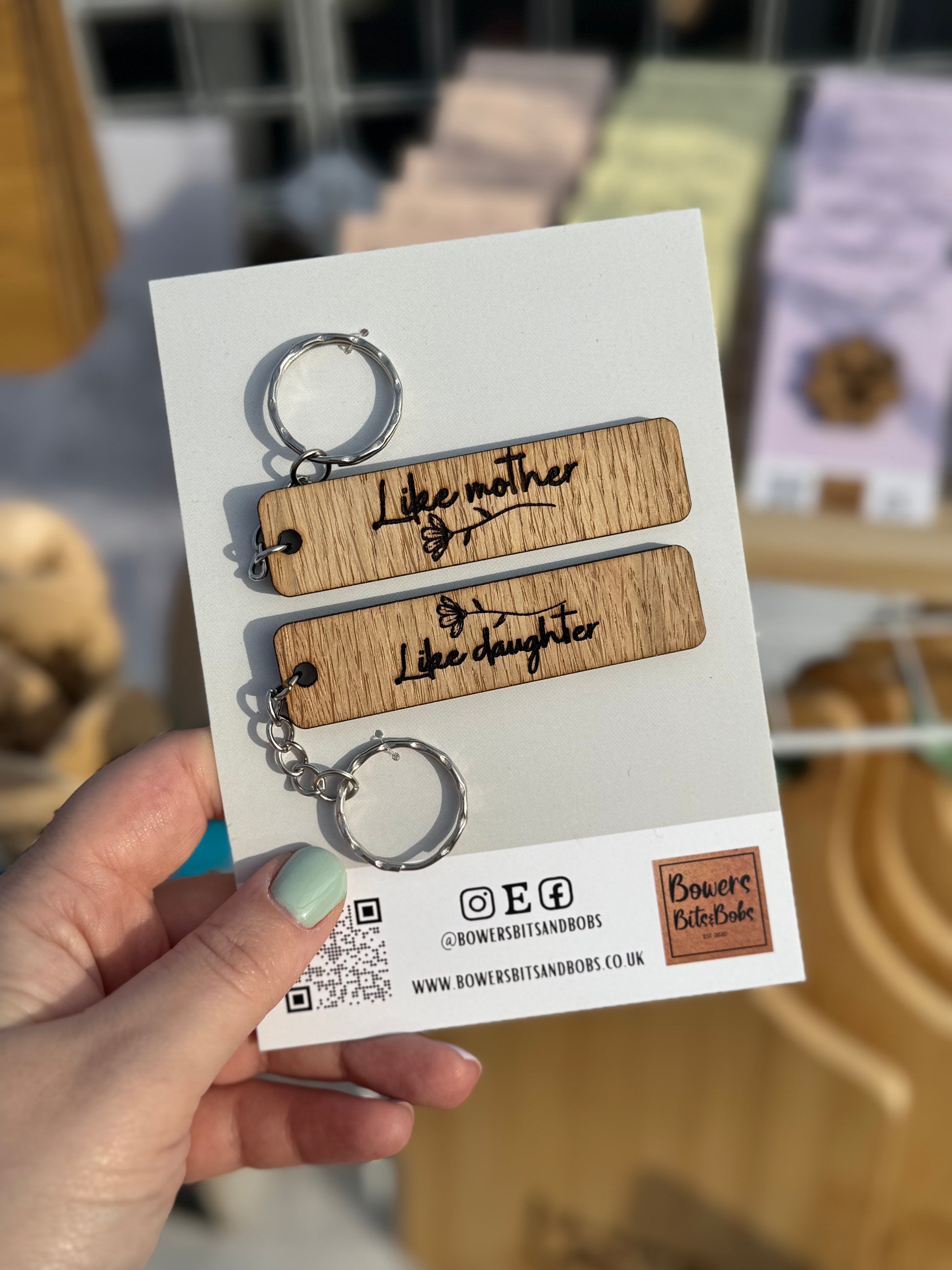 keyrings made with oak veneer and engraved with ‘like mother’ and ‘like daughter’ and a matching flower on each.