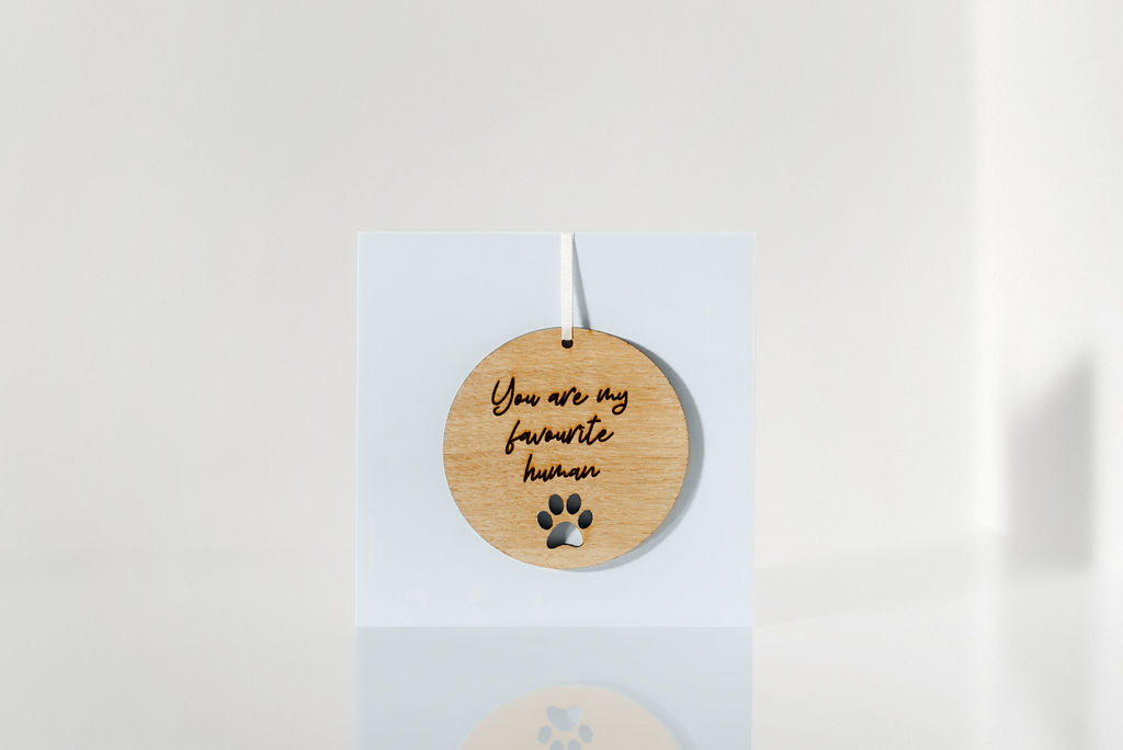 Our standard design comes engraved with 'You're my favourite human' and a pawprint cutout as seen in photos.
