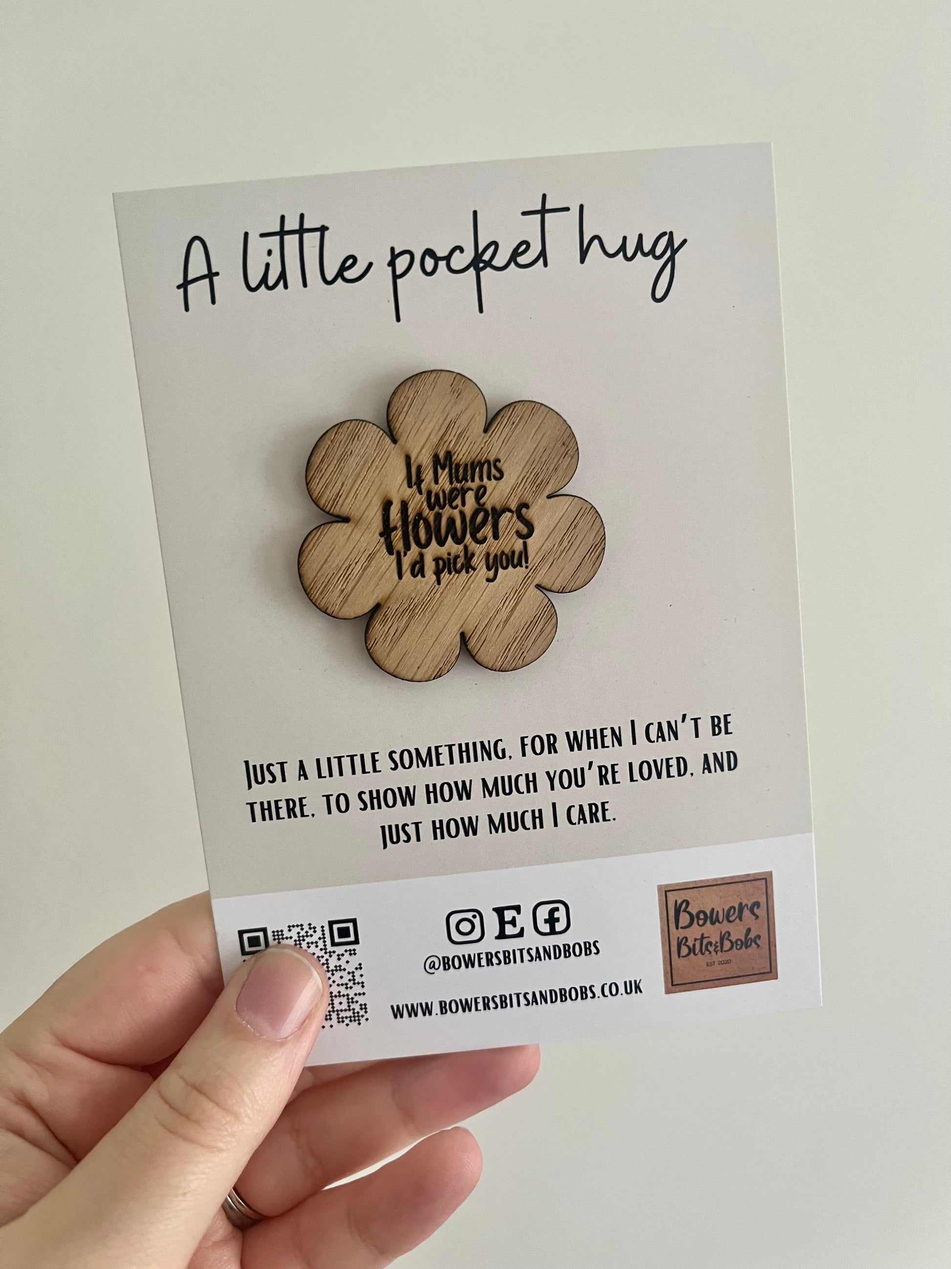 Our best selling pocket hugs come as standard with 'A Little Pocket Hug' at the top of the card, and underneath the hug token reads 'Just a little something, for when I can't be there, to show how much you're loved, and just how much I care.' Hug token is 5cm at it's widest point, and is engraved with 'If Mums were flowers, I’d pick you!’ design as shown in pictures.