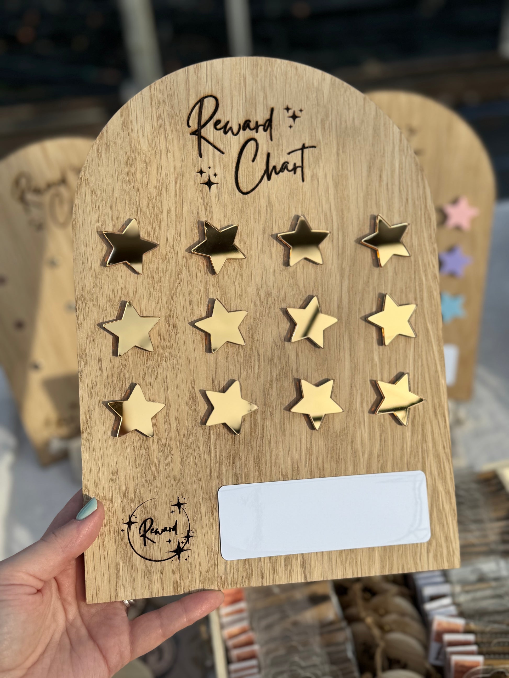 The main backboard is A4 sized sleek oak veneer, and the star magnets are all 3mm acrylic - in a choice of pastel multicolour or gold mirror (as seen in photos). Plus, there's a dry wipe space where you can write your custom reward, making it easy to remember what’s up for grabs once the chart is complete!