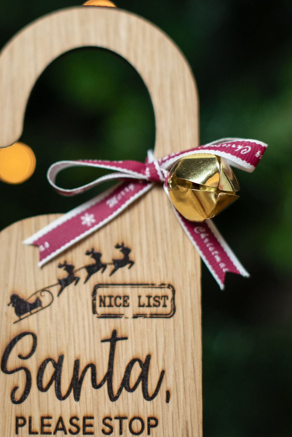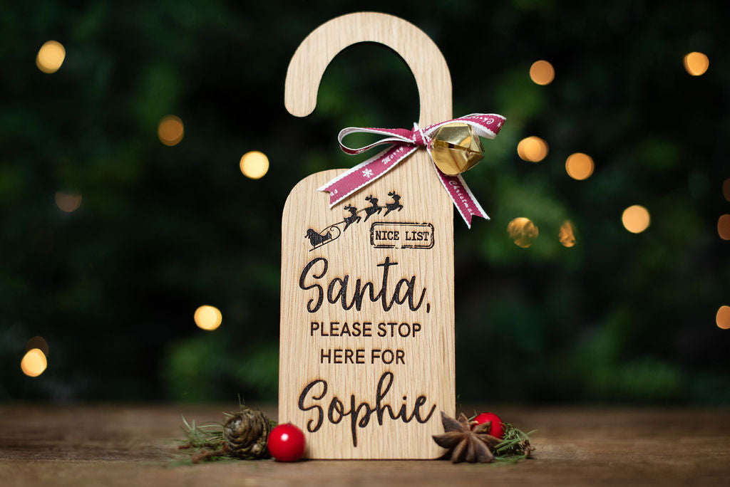 Oak veneer hanger engraved with 'Santa please stop here', along with beautiful Christmas imagery.