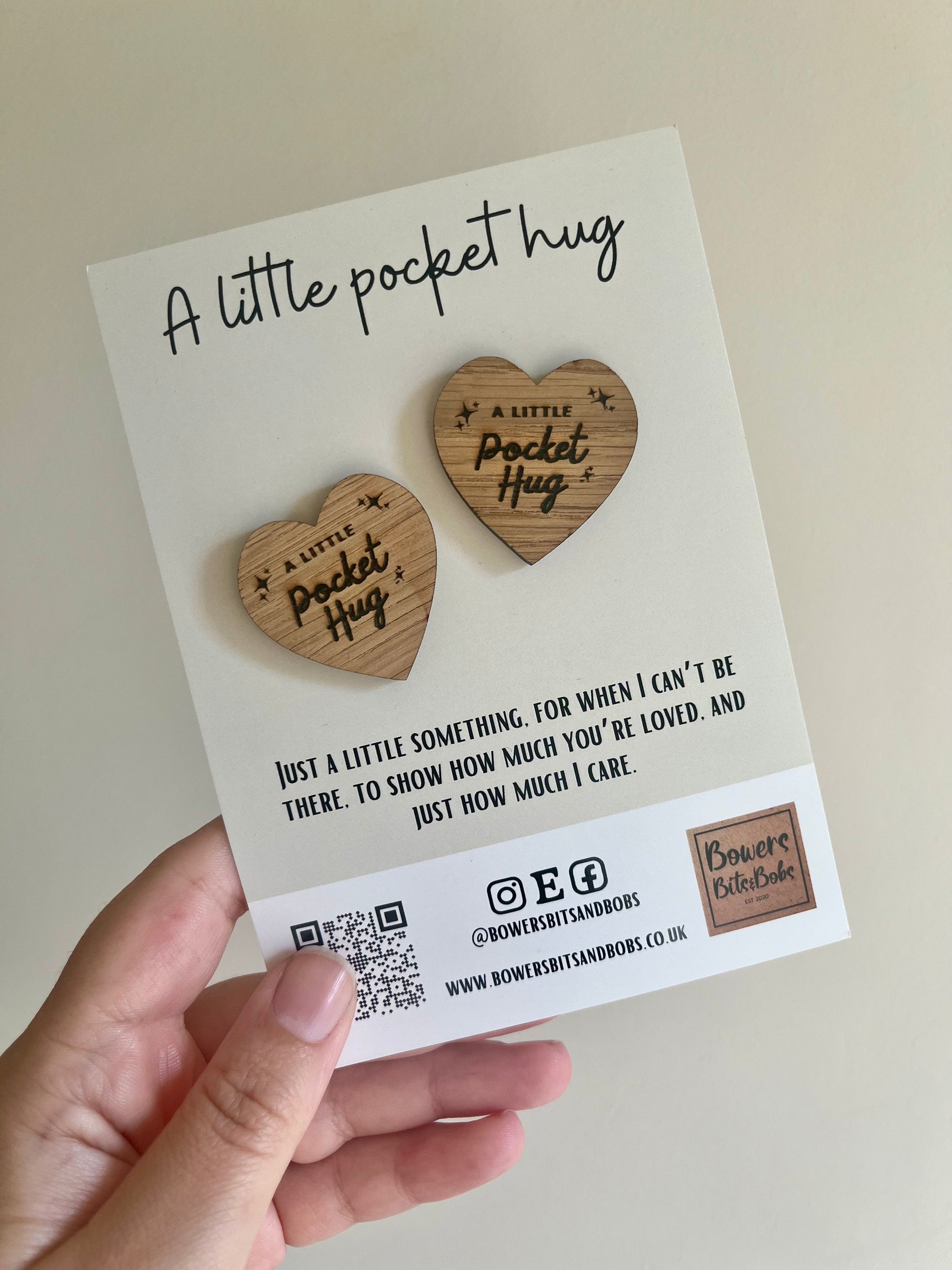Our best selling pocket hugs come as standard with 'A Little Pocket Hug' at the top of the card, and underneath the hug token reads 'Just a little something, for when I can't be there, to show how much you're loved, and just how much I care.' Hug tokens are 3cm at their widest point, and are engraved with 'A little pocket hug' design as shown in pictures.