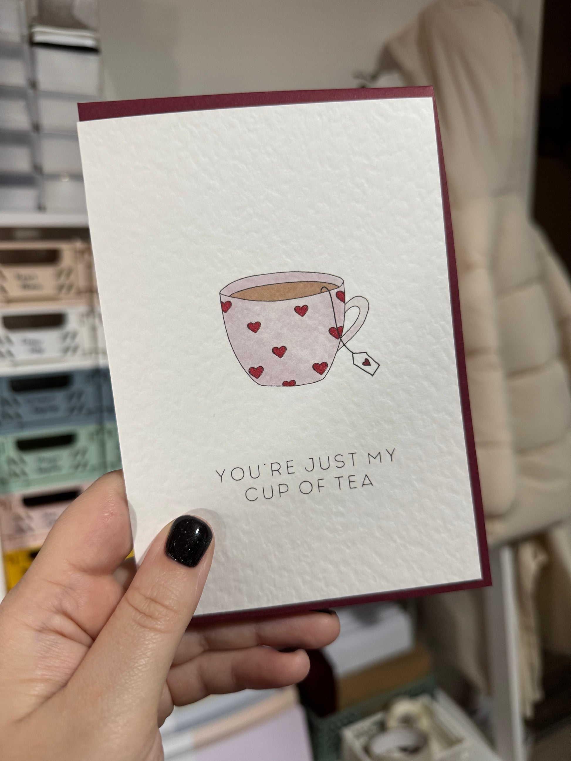 Cards read ‘You're just my cup of tea’ on the front and the inside is blank for your own message.